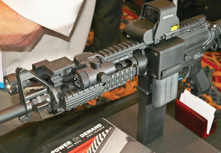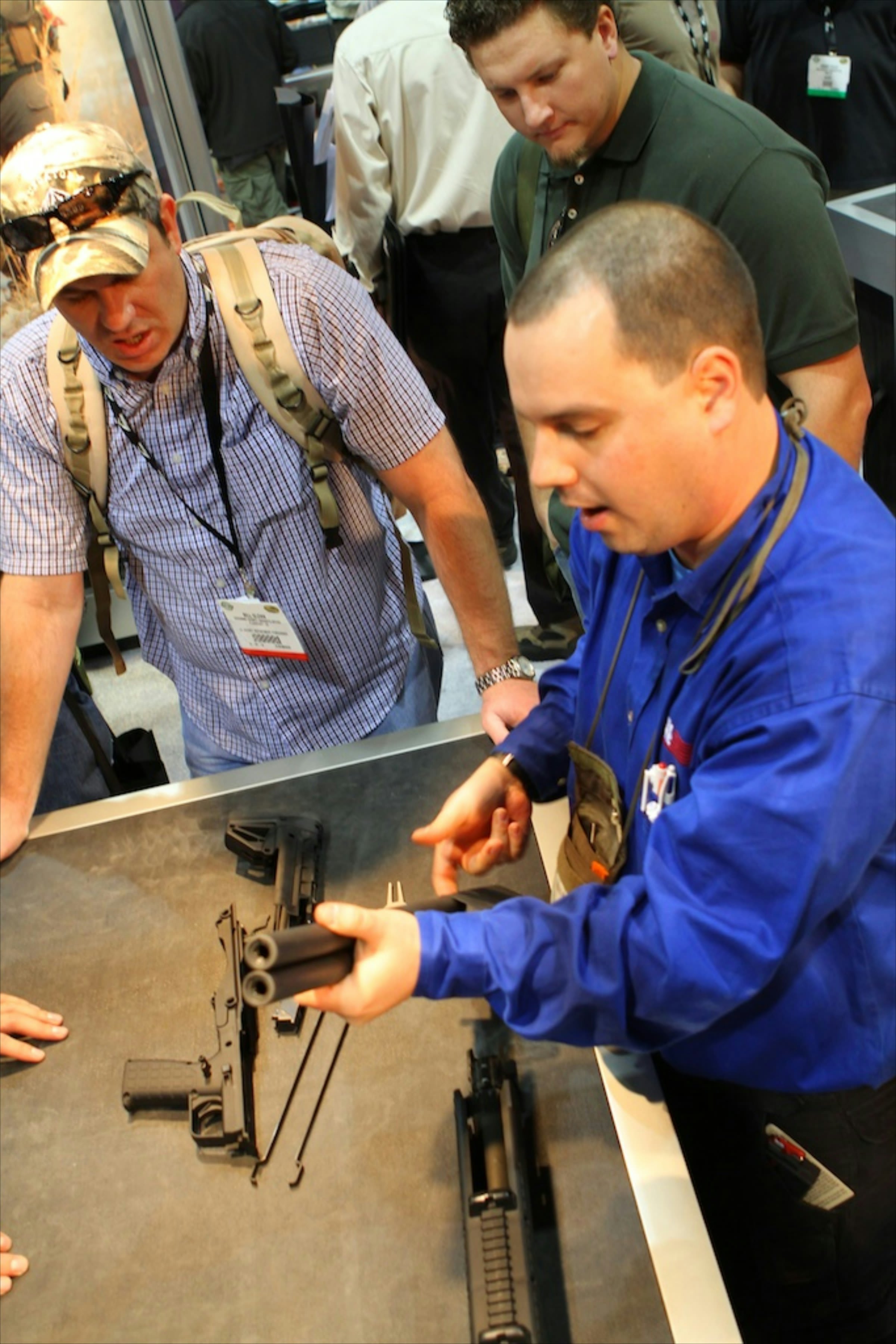 A Kel-Tec rep dissassembles the KSG, 14-round dual-magazine shotgun.