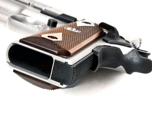 The pistol is fitted with Novak-style low mount three-dot sights. Square-cut grasping grooves enable retraction of the slide even with wet hands or while wearing gloves.