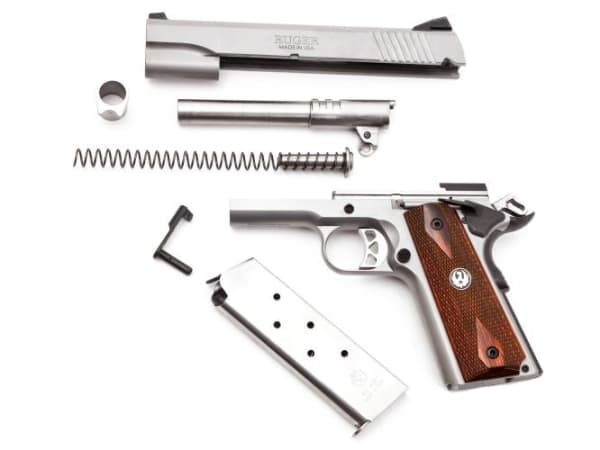 Disassembly shows the Browning-style recoil system used in Ruger's SR1911 pistol.