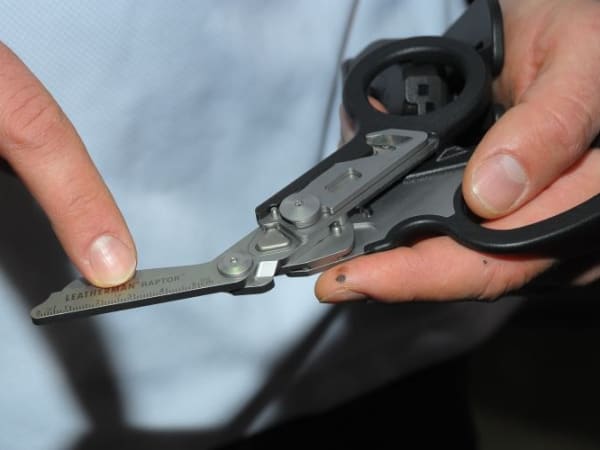 Leatherman's 420HC stainless-steel Raptor shears offer a strap cutter, oxygen wrench, ring cutter, and carbide-tip glass breaker.