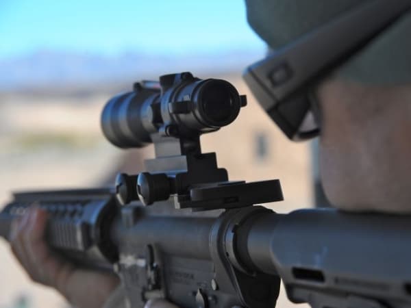 Trijicon's ACOG (Advanced Combat Optical Gunsight) 3x30 optic with a 300 AAC Blackout reticle provides sighting for supersonic and subsonic velocities.