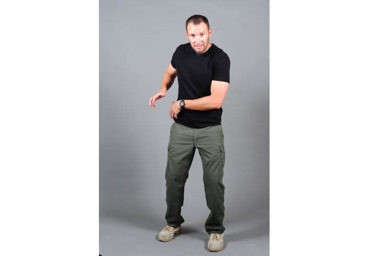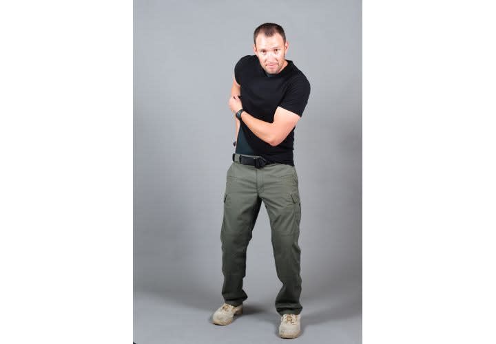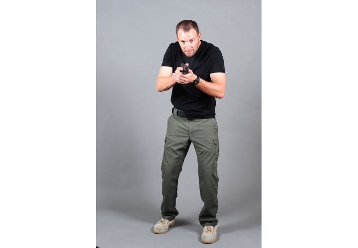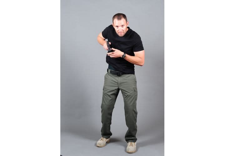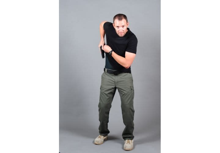As your primary hand is reaching for the weapon, your support hand should simultaneously be grabbing the clothing that is as close to the weapon as possible and getting the material out of the way.