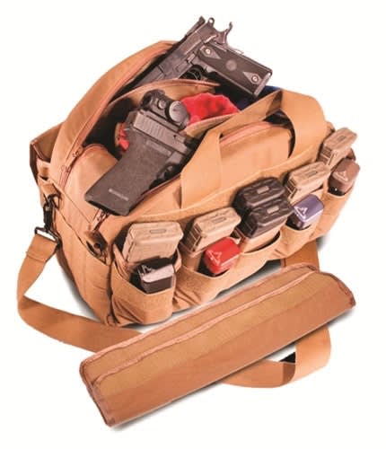 Tuff Products' Multi-Gun Range Bag is constructed of single- and double-layer Cordura and features two inner firearm padded compartments, two adjustable padded dividers, and dual exterior magazine pouches with removable flaps. Each magazine pouch holds five AR-15/M4 and five pistol magazines. A shoulder strap is included.