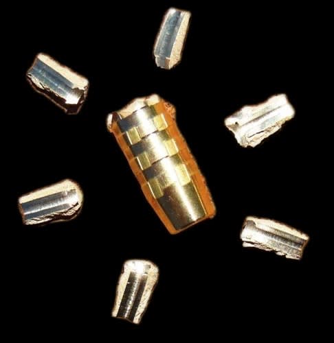 These bullets are a flat base, monolithic brass design machined on a CNC Swiss-style lathe. The 100-grain has crimping grooves specifically placed for use in 300 Blackout, 300 Whisper, .308 Winchester, and 300wt. These bullets employ the same technology as the rest of Cutting Edge Bullets' Raptor series. After 1 to 2 inches of penetration, the front nose portion breaks off into six pieces that radiate outwards in a star pattern while the base continues through for even deeper penetration.